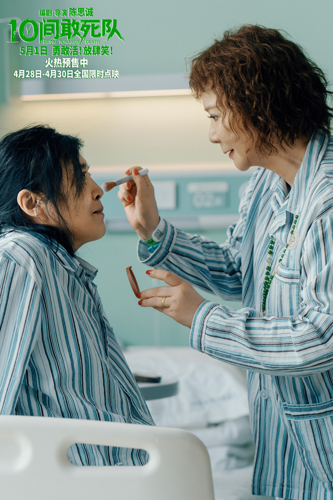 饰演护工章小兵的蒋龙前一秒还在拥抱天空“做大做强”,喊“卡”后立马腿软向生活“低头”。蒋龙曾透露,天台戏份表面笑果拉满,但实拍过程中他和杨超越全靠一股劲儿互相支撑,结束后杨超越的胳膊上全是淤青的“勋章”。戏里的护士谢谢勇敢尽责,镜头外的杨超越也会对着“爱情模范”齐溪(饰甄艾)、王子川(饰贾导)俏皮点名“小帅+小美”。贾导偶尔癫癫,但甄艾总能发挥“真爱无敌”buff;“撬起奥斯卡”能量爆炸之余,齐溪一语点破影片的“笑泪循环”——“笑着笑着就哭了,哭着哭着又笑了”。张弛和蒋龙无处不诠释“特别丝滑的默契”,二人角色即使倒霉也难掩林强生“干饭大王”的本色。倪大红老戏骨自如应对“孝”出强大,不仅能一边被儿子(曹炳琨饰)提溜着“巡游”,一边保持“痛苦面具”的入戏状态,还打起了游“鸡”战,带着“10号房”团宠小小冰(叶泉希饰)一起偷吃炸鸡。赵博文(黄毅饰)日常挑“帘”夜读,在笑闹之中过滤来自父亲(成泰燊饰)的“窒息”关怀。如此优美的精神状态贯穿银幕内外,看得蔡明(饰马美丽)直呼要赶紧“逃离”,然而热心马姐转头就“警告”骆驼不许吓坏孟梅(丁嘉丽饰),“好闺闺”二人组吃香喝辣也躲不过易主任(田雨)的健康叮嘱。