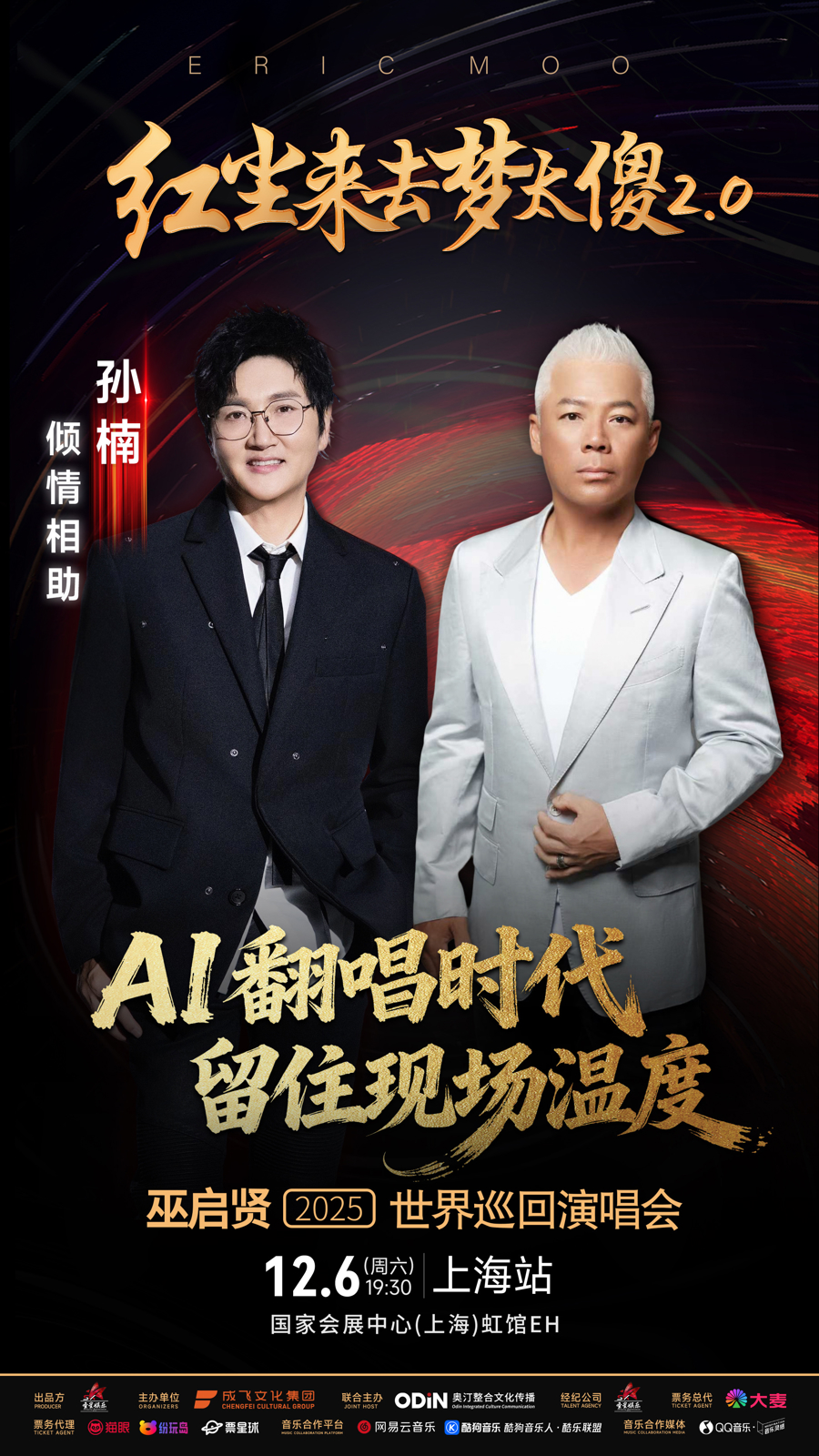 12月6日,华语乐坛“情歌手术师”巫启贤将携“红尘来去梦太傻2.0”世界巡回演唱会登陆国家会展中心(上海)虹馆EH。本次巡演在歌单编排、舞美制作等方面均较此前实现全方位升级。上海站现场,巫启贤将以跨越40年的经典旋律与全开麦演唱实力,为观众呈现一场兼具音乐质感与情感温度的视听盛宴。值得一提的是,上海站特邀孙楠担任重磅嘉宾,两大华语唱将即将久违合体,联手打造限定舞台,将为演出再添高光亮点。