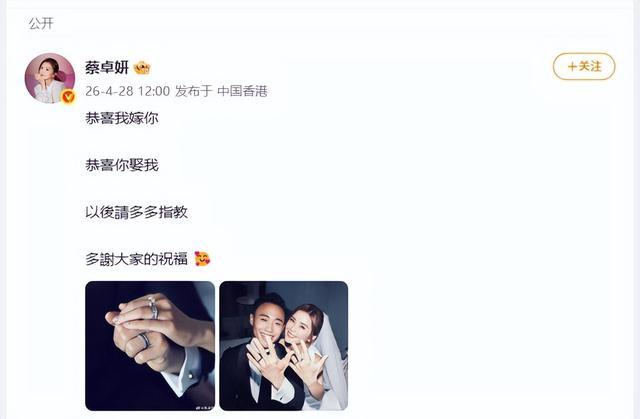 4月28日,蔡卓妍(阿sa)发文:恭喜我嫁你,恭喜你娶我,以后请多多指教,多谢大家的祝福。